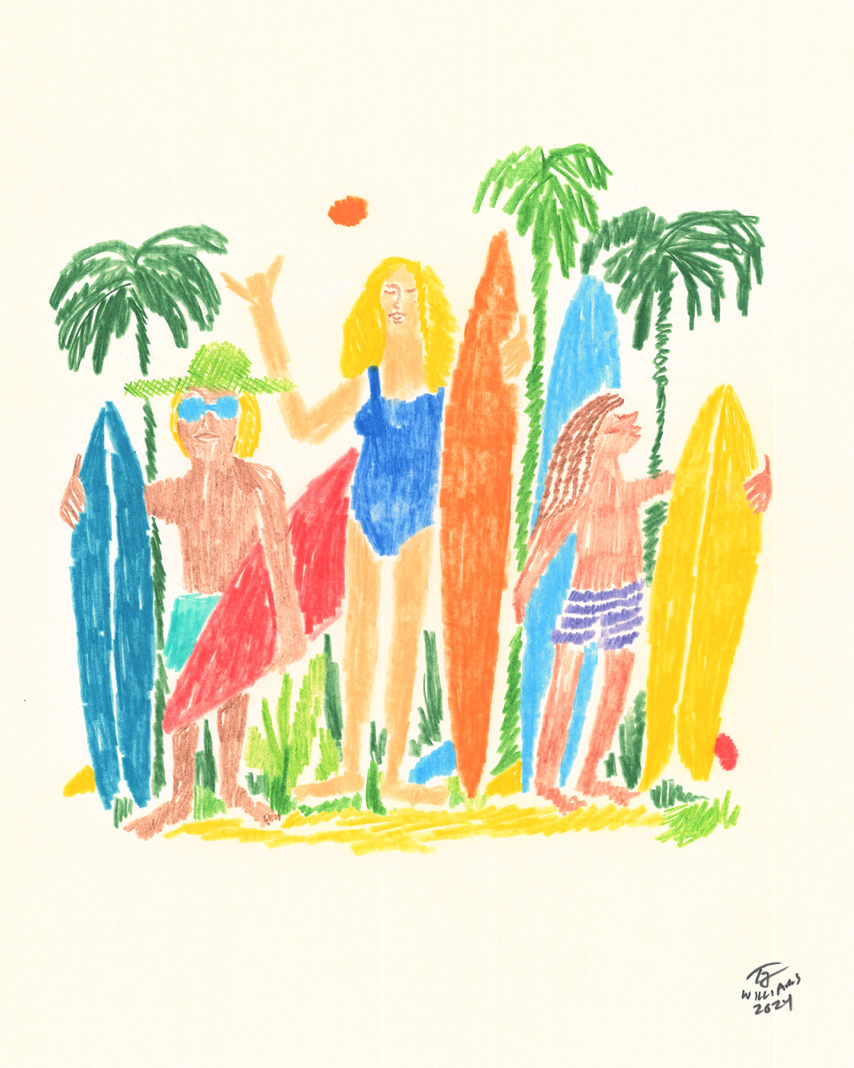 タイ・ウィリアムズは、メイン州出身の多才なアーティスト。彼の作品は、メイン州の海岸線でのサーフィンの経験、サーフトリップでの幼少期の経験が影響を与えています。Patagoniaなどの象徴的なブランドやAce Hotelなどのプロジェクトとコラボレーションしてきました。彼の幅広い作品は、壁画からTシャツのグラフィック、テキスタイルのパターン、アルバムのアートワークまで。アートはアメリカだけでなく、日本、オーストラリア、ニュージーランド、インドネシアでも展示されており、彼の作品は海をテーマにしています。